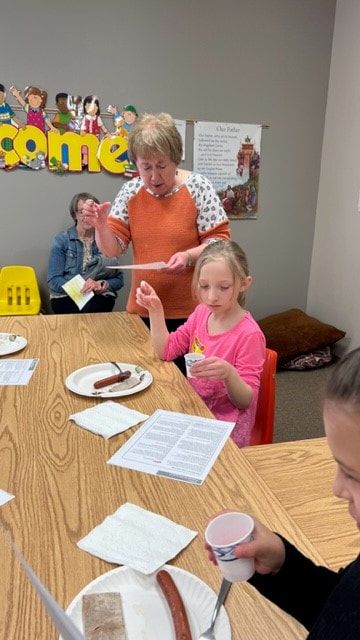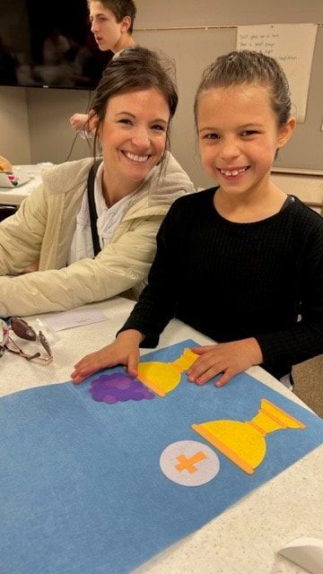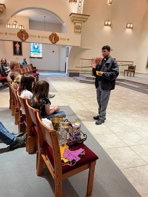 The families learned about the vessels used during the Liturgy of the Eucharist and practiced receiving.